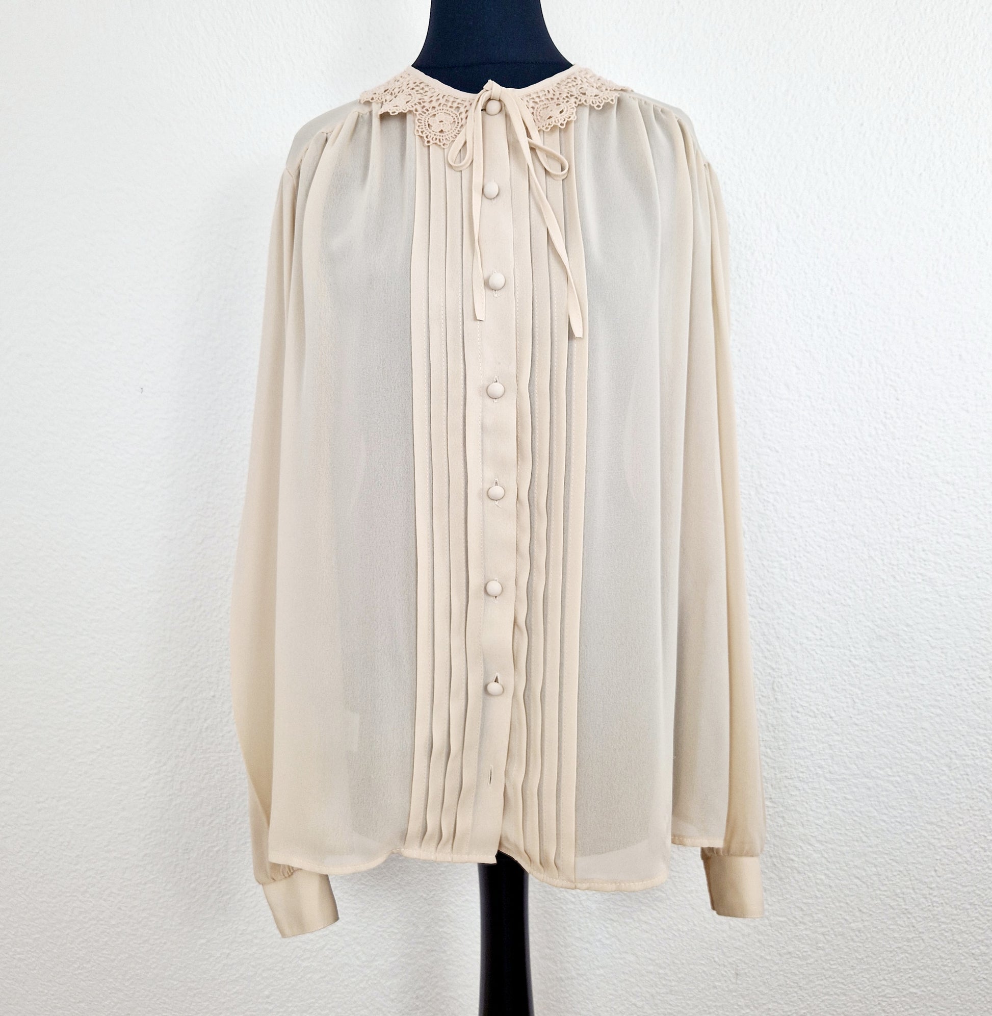 Diese Bluse bringt einen Hauch britischer Noblesse in Deinen Alltag – mit Spitze, Schleife und 80s-Finesse für nostalgische Vintage Momente.